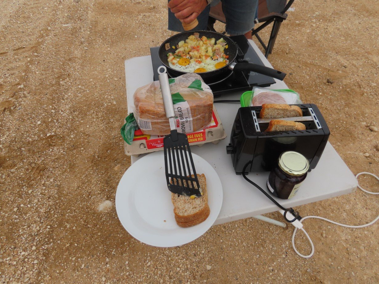We drove back to the main track and there Stefaan decided this was the perfect place to have a break to calm my nerves! He set up our brunch spot in the middle of the desert and made toast and potato-egg skillet a la Masterchef!